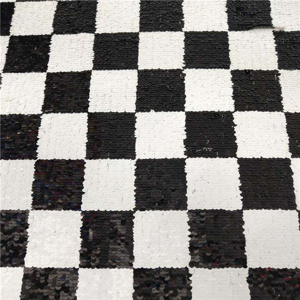 Our black geometric sequin fabric is made from 5mm eco-friendly PET sequins embroidered on breathable satin base fabric, arranged in fish scale pattern. Each row covers a third of the next row, creating reversible geometric design (approx. 5cm squares) with striking black-and-white contrast. Perfect for backdrops, gowns, costumes, and DIY fashion.