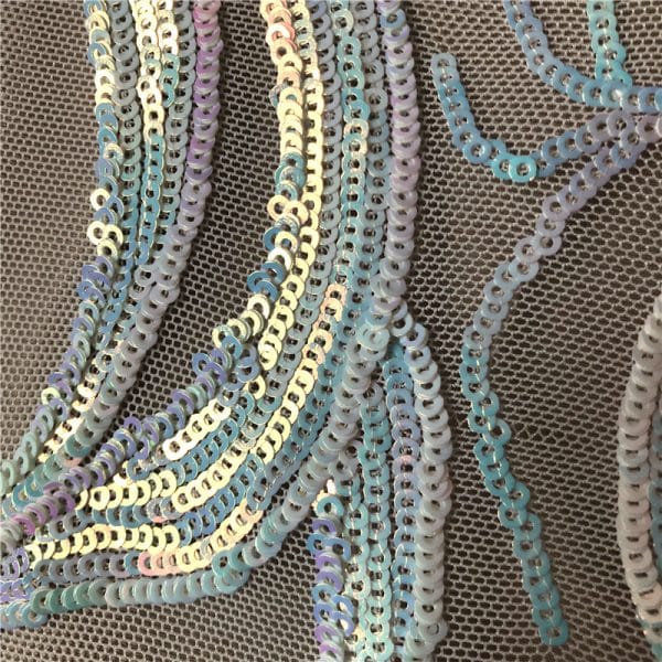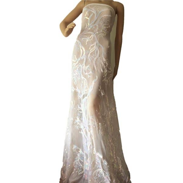 Made from 3mm eco-friendly PET sequins, it is meticulously embroidered on sturdy mesh base fabric. They come together to form an elegant flower and twig pattern that’s as tactile as it is visual. We believe sparkle should last, so we’ve crafted this fabric to be both durable and flexible, ensuring your creations dazzle season after season.