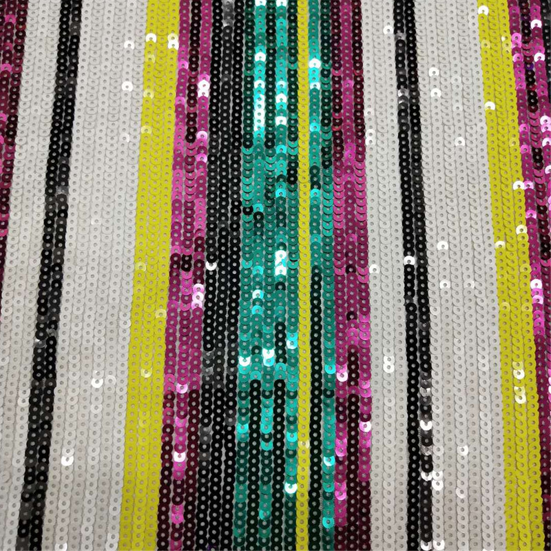 Looking for affordable and stylish sequin fabric?Browse our eco-friendly rainbow stripe sequin fabric. The perfect decoration for adding an elegance and decorative beauty to your products.This rainbow stripe sequin fabric is made from eco-friendly round shapes 5mm different colors shinny sequins embroidered on lace fabric and create stripe design