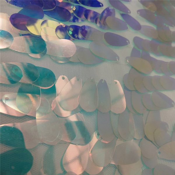 | Materail: | Eco-friendly PET teardrop sequins with mesh fabric base or customized base fabric. |